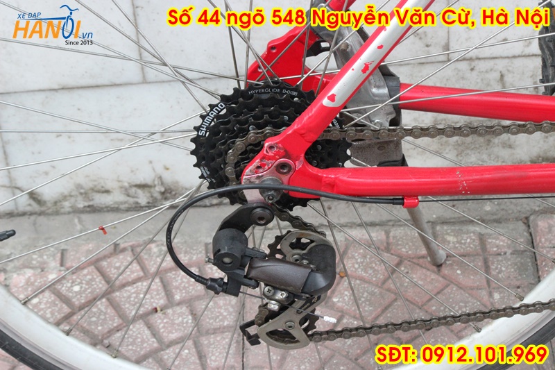 Mã số 911, khung nhôm, sơn zin, sise 51 cm phù hợp cao hơn 1m62 cm, groups Shimano 3 đĩa 7 líp số gẩy, vành nhôm 2 lớp 700c 700c, lốp 700 x25c thông dụng, ghi đông postang nhôm hãng Zoom, đùi đĩa mayo nhôm